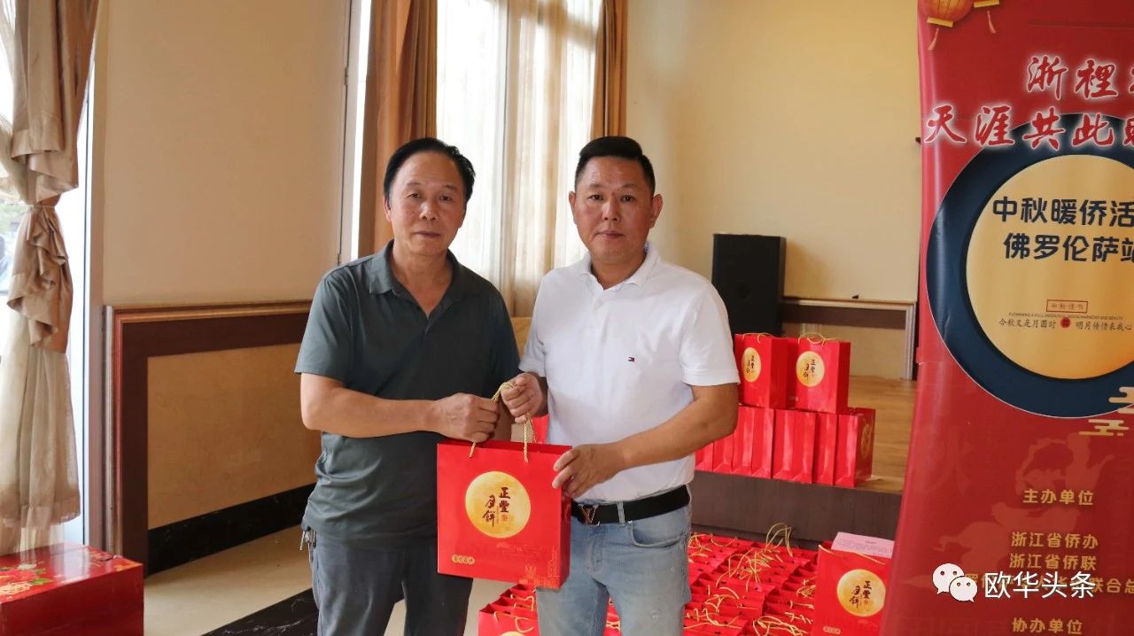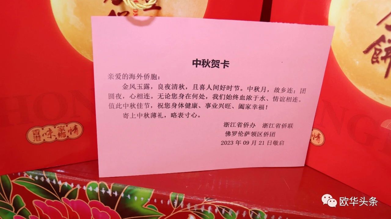 每份月饼礼盒上还附带了一张中秋贺卡,上面写有美好的祝愿和对侨胞们的问候。这份特殊的礼物让侨胞们感受到了浙江省侨办、浙江省侨联和佛罗伦萨领区侨团的关怀和祝福。